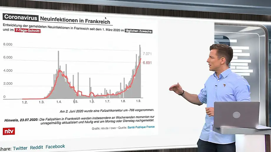07.09.2020, 12:32 UhrWie hat sich die tägliche Neuinfektions-Zahl entwickelt? Wo gibt es Infektionsherde? Mit aktuellen Fakten zum Infektionsgeschehen ordnen die ntv-Moderatoren Daniel Schüler und Doro Steitz mit dem Epidemiologen Timo Ulrichs die Corona-Lage in Deutschland und der Welt ein.