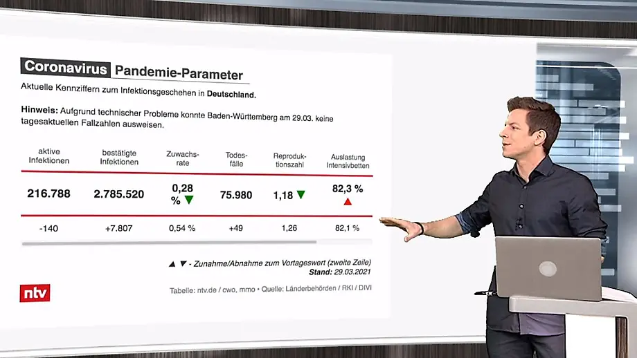 30.03.2021, 11:26 UhrWie hat sich die Zahl der täglichen Neuinfektionen entwickelt? Wie ist die Lage auf den Intensivstationen? Mit aktuellen Fakten zum Infektionsgeschehen ordnet das ntv-Moderatorenteam Daniel Schüler und Nina Lammers mit der Pandemie-Beauftragten Tübingens, Dr. Lisa Federle, die Corona-Lage in Deutschland und der Welt ein.