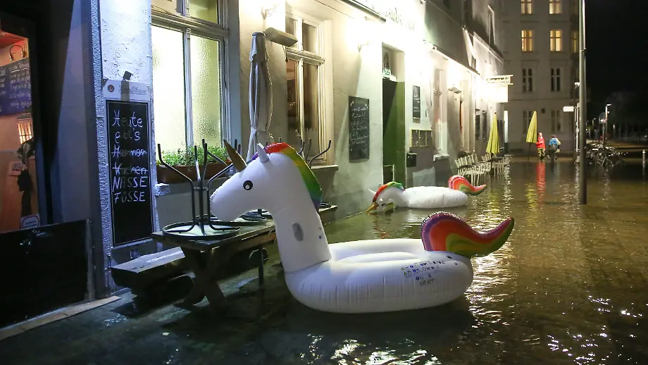 Kanus, Einhörner, SurferNordlichter machen das Beste aus Sturmflut-Folgen