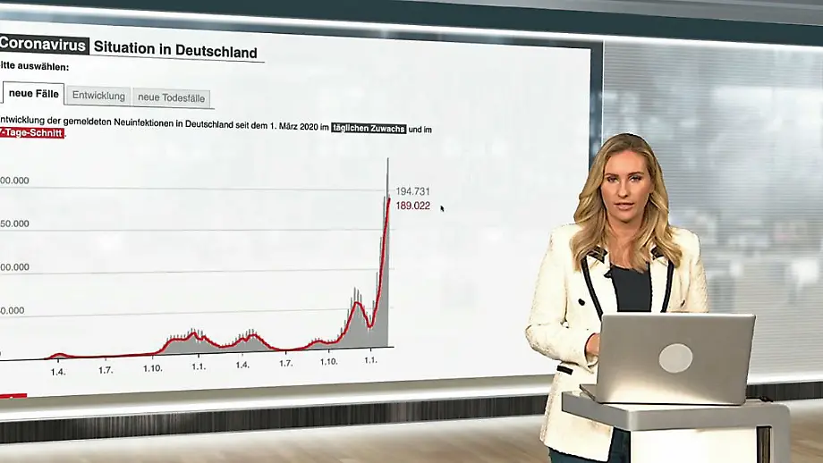 09.02.2022, 11:04 UhrWie hat sich die Zahl der täglichen Neuinfektionen entwickelt? Wie ist die Lage auf den Intensivstationen? Mit aktuellen Fakten zum Infektionsgeschehen ordnen die ntv-Moderatorinnen Anne-Katrhin Cyrus und Vivian Bahlmann zusammen mit dem Intensivmediziner Prof. Uwe Janssens die Corona-Lage in Deutschland und der Welt ein.