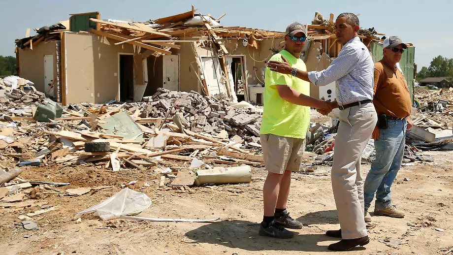 08.05.2014, 10:07 UhrZwischen Trümmern und Schutt: US-Präsident Barack Obama besucht die Gebiete, durch die vor anderthalb Wochen eine schwere Tornado-Serie raste, und spricht den Betroffenen Mut zu. In den US-Bundesstaaten Oklahoma, Kansas und Arkansas starben 30 Menschen, viele Häuser wurden zerstört.