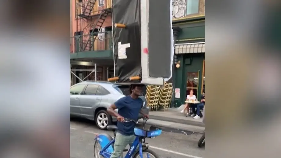 Kaum zu glauben, aber wahrRadfahrer balanciert Couch auf dem Kopf