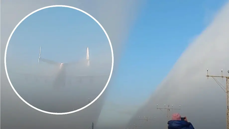 Spektakuläre Szene im TiefflugRiesige Antonow reißt Schneise in dichten Nebel
