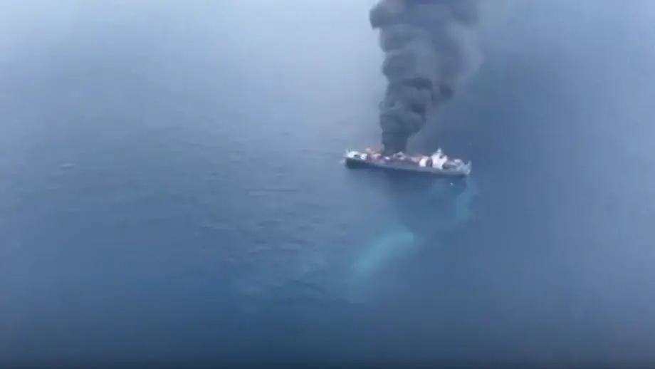 Explosion - Fracht fällt von BordRiesige Rauchsäule türmt sich über Containerschiff auf