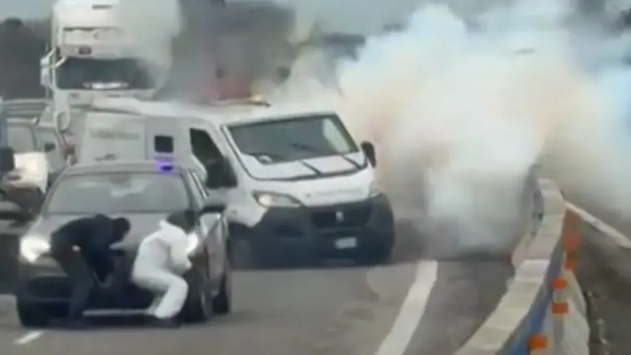 09.02.2026, 14:30 UhrEin Handyvideo zeigt chaotische Szenen aus Italien: Auf einer viel befahrenen Autobahn starten bewaffnete Männer mit einem als Polizeiwagen getarnten Pkw einen Überfall auf zwei Geldtransporter. Brennende Fahrzeuge blockieren die Fahrbahn, es kommt zu Explosionen und einem Schusswechsel.