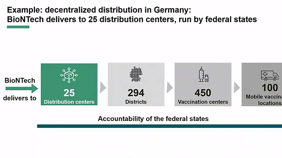 22.12.2020, 10:23 UhrKurz vor dem Start der europäischen Impf-Kampagne informiert der Pharmahersteller Biontech zum Stand der Produktion und Lieferung seines Corona-Impfstoffs. Am Beispiel Deutschlands wird die komplexe Lieferkette von Verteilzentren der Bundesländer bis hin zu mobilen Impfzentren erläutert.