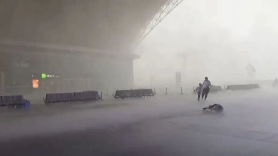 28.07.2023, 14:55 UhrPassagiere eines Bahnhofs in Yantai werden plötzlich von einem Orkan überrascht. Die Menschen flüchten ins Bahnhofsgebäude, der Aufenthalt draußen wird zu gefährlich. Immer wieder reißt der Sturm Menschen um, eine Mutter und ihr Kind werden von Reisenden gerettet.