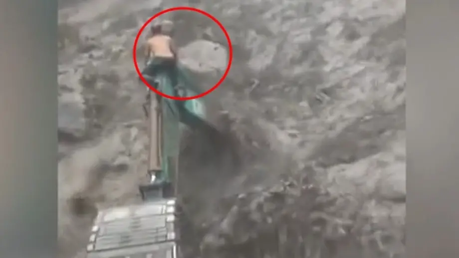 Dramatische Szene in WassermassenSturzflut mit Felsgeschoss überrascht Baggerfahrer