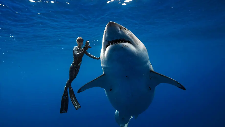 18.01.2019, 18:00 UhrDie Hai-Forscherin Ocean Ramsey erlebt zusammen mit anderen Tauchern ein beeindruckendes Schauspiel. Sie treffen vor Hawaii auf einen riesigen Weißen Hai. Der sanfte Riese "Deep Blue" misst eine beachtliche Länge von sechs Metern und ist dazu auch schwanger.