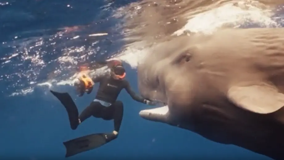 Gigant will nur spielenTaucher tollt sorglos mit tonnenschwerem Pottwal-Baby