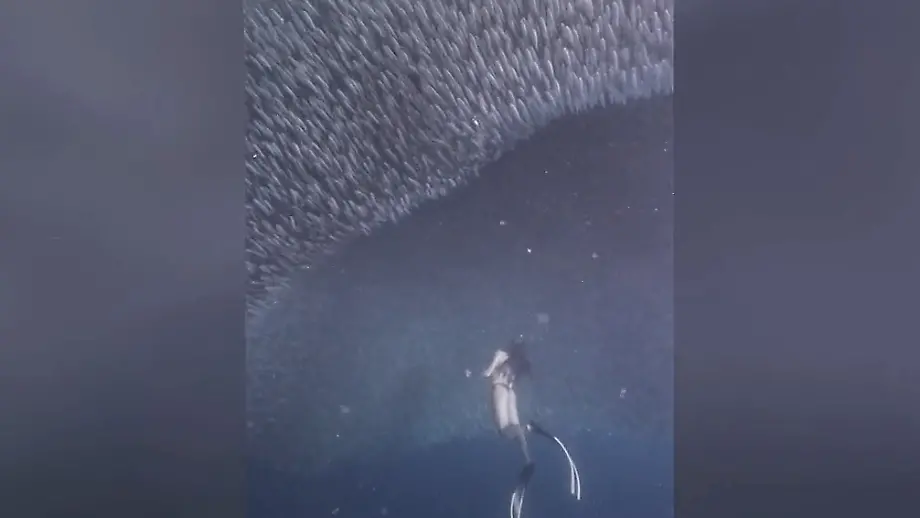 Spektakuläre Unterwasser-BegegnungTaucherin schwimmt auf gigantisches Sardinen-"Portal" zu