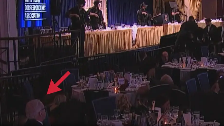 26.04.2026, 17:39 UhrPanik beim White House Correspondents' Dinner mit US-Präsident Trump: Als plötzlich Schüsse eines Angreifers zu hören sind, stürmen bewaffnete Sicherheitskräfte die Bühne. Die Gäste gehen unter Tischen in Deckung - bis auf einen. Er zeigt sich von der Unruhe unbeeindruckt und isst einfach weiter.