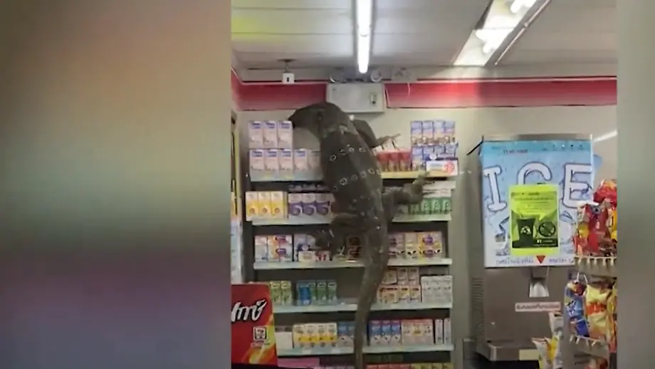 08.04.2021, 13:32 UhrEin kletterfreudiger Waran sorgt in einem Supermarkt für Aufregung. Bindenwarane sind in städtischen Gebieten oft auf der Jagd nach Hühnern. Doch die erspäht das Tier von seinem Aussichtsposten vermutlich nicht. Nach einigen Schreckminuten wird der akrobatische Gast von Tierfängern hinausbegleitet.