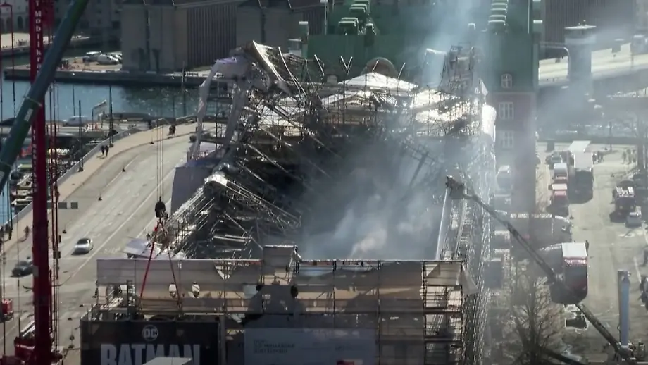 17.04.2024, 21:15 UhrAufnahmen aus dem Inneren der 400 Jahre alten Börse in Kopenhagen zeigen die Zerstörungskraft des Feuers. "Alle tragenden Strukturen sind weggebrannt", sagt der Einsatzleiter und erklärt, dass aufgrund eines Einsturzrisikos die Wände stabilisiert werden.