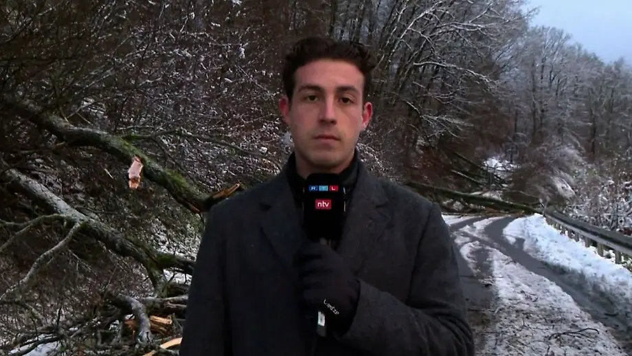 28.11.2023, 10:46 UhrDer Winter hat zugeschlagen und im hessischen Rheingau-Taunus-Kreis brauchen Autofahrer starke Nerven: Umgestürzte Bäume und im Schnee festgefahrene LKW blockieren die Straßen. Das bekommen bei Schlangenbad auch Felix Breiner und sein Kameramann zu spüren. Die Lage sei weiterhin gefährlich, so der ntv-Reporter.