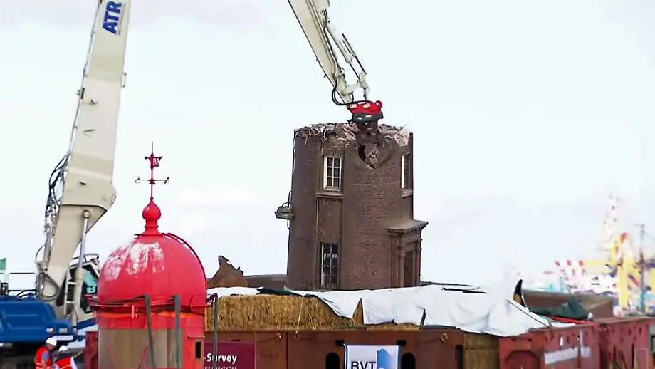 29.08.2022, 11:21 UhrDas eingesackte Wahrzeichen der Stadt Bremerhaven könnte heute schon Geschichte sein. Wie aktuelle Bilder zeigen, wird der schiefe Leuchtturm abgetragen. Die angekündigte "Knabber"-Taktik kann nicht ganz umgesetzt werden, berichtet ntv-Reporterin Sarina Sprengelmayer.