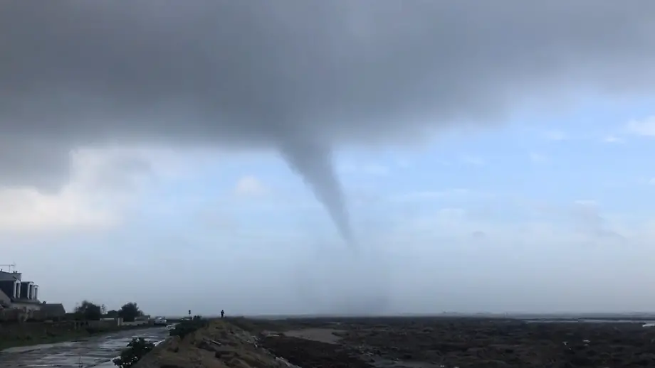 02.11.2022, 20:50 UhrVor der Küste der westfranzösischen Gemeinde Penmarch zieht eine Wasserhose entlang. Verletzt wird durch den Wirbelsturm offenbar niemand. Zuvor hatte Sturm "Claudio" für schwere Schäden in Westfrankreich gesorgt.