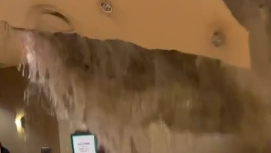03.02.2026, 11:34 UhrIn einem Hotel in Oklahoma zerbirst die Lobbydecke unter Wassermassen und kracht in den Raum herunter. Aufnahmen zeigen, wie zuvor schon Wasser aus der Decke läuft. Mitarbeiter des Hotels vermuten Schäden durch Winterkälte als Ursache.