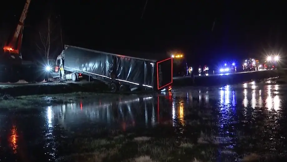 Starkregen, Gewitter, SturmWindböe fegt LKW von Straße und kippt ihn auf PKW