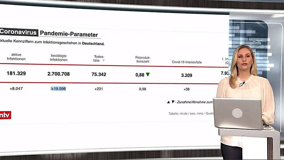 25.03.2021, 12:32 UhrWie hat sich die Zahl der täglichen Neuinfektionen entwickelt? Wie ist die Lage auf den Intensivstationen? Mit aktuellen Fakten zum Infektionsgeschehen ordnet das ntv-Moderatorenteam Anne-Kathrin Cyrus und Doro Steitz mit dem Epidemiologen Timo Ulrichs die Corona-Lage in Deutschland und der Welt ein.