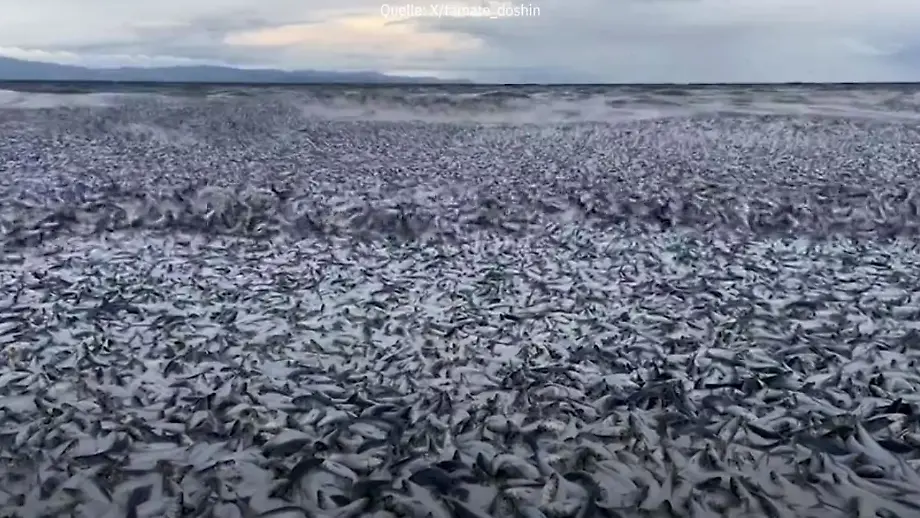 08.12.2023, 13:07 UhrAuf einer Länge von einem Kilometer wird ein japanischer Strand von Zehntausenden toten Fischen überflutet. Hauptsächlich soll es sich um Sardinen und Makrelen handeln. Was das Massensterben ausgelöst hat, ist bisher noch ungeklärt.
