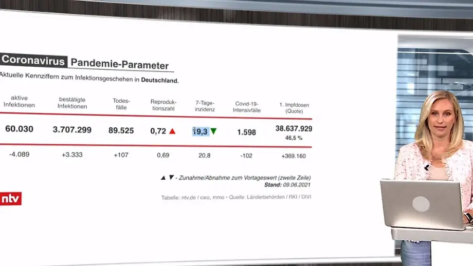 10.06.2021, 11:44 UhrWie hat sich die Zahl der täglichen Neuinfektionen entwickelt? Wie ist die Lage auf den Intensivstationen? Mit aktuellen Fakten zum Infektionsgeschehen ordnen die ntv-Moderatorinnen Anne-Kathrin Cyrus und Nele Balgo zusammen mit dem Epidemiologen Prof. Timo Ulrichs die Corona-Lage in Deutschland und der Welt ein.