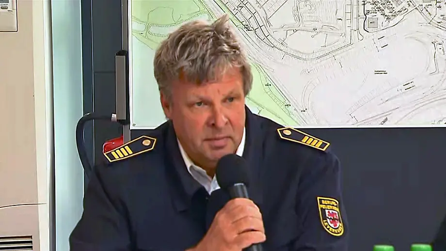 28.07.2021, 18:23 UhrDie Explosion im Chempark Leverkusen erzeugt einen verheerenden Folgebrand. Mindestens zwei Menschen sterben, mehrere werden schwer verletzt. Der Chef der örtlichen Feuerwehr berichtet in einer Pressekonferenz sichtlich betroffen von den Lösch- und Rettungseinsätzen.