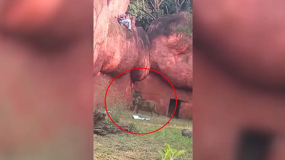26.11.2021, 15:02 UhrHandyaufnahmen aus einem Zoo im indischen Hyderabad zeigen eine rätselhafte Situation: Ein Mann versucht, von oben in ein Raubtiergehege zu steigen. Ein Löwe wartet bereits auf den Eindringling. Was den Mann zu der Aktion bewegt, ist nicht ganz klar.
