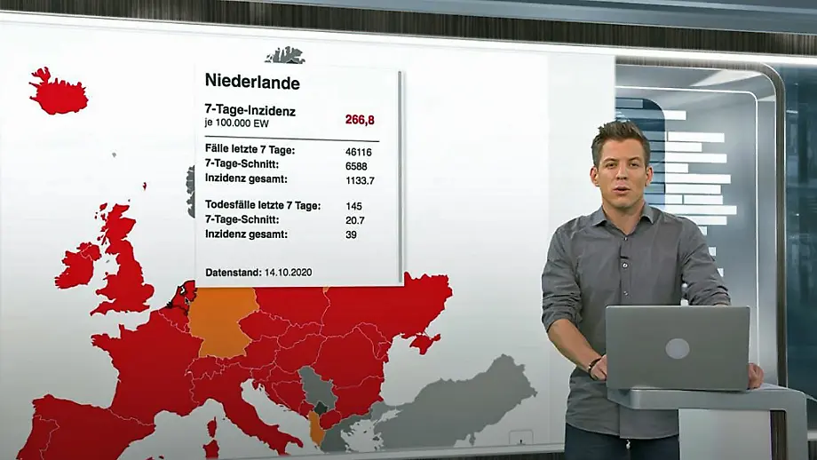 17.10.2020, 09:25 UhrWie hat sich das Infektionsgeschehen entwickelt? Mit einem Rückblick auf die Woche ordnet das ntv-Moderationsteam Daniel Schüler und Katrin Neumann zusammen mit dem Epidemiologen Prof. Timo Ulrichs die Corona-Lage in Europa ein. Fragen können Zuschauer an "Coronafragen@ntv.de" schicken.