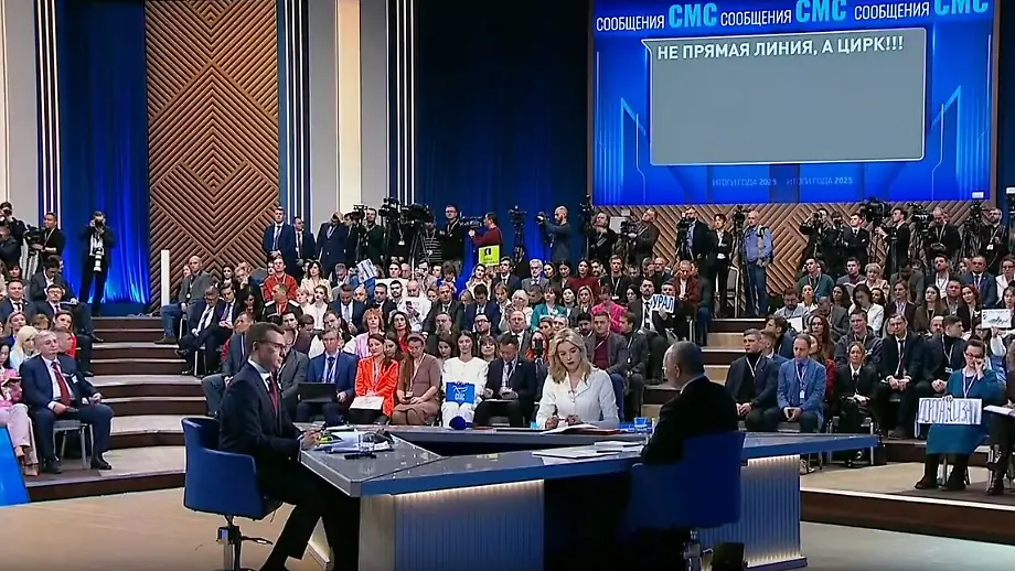 19.12.2025, 13:40 UhrKreml-Chef Putin gibt seine jährliche große TV-Runde, in der er sich stundenlang Fragen stellen lässt. Die sind typischerweise allerdings handverlesen und vorsortiert. Für Stirnrunzeln sorgt gerade deshalb der Moment, als auf dem Bildschirm hinter Putin plötzlich eine kritische SMS eingeblendet wird.