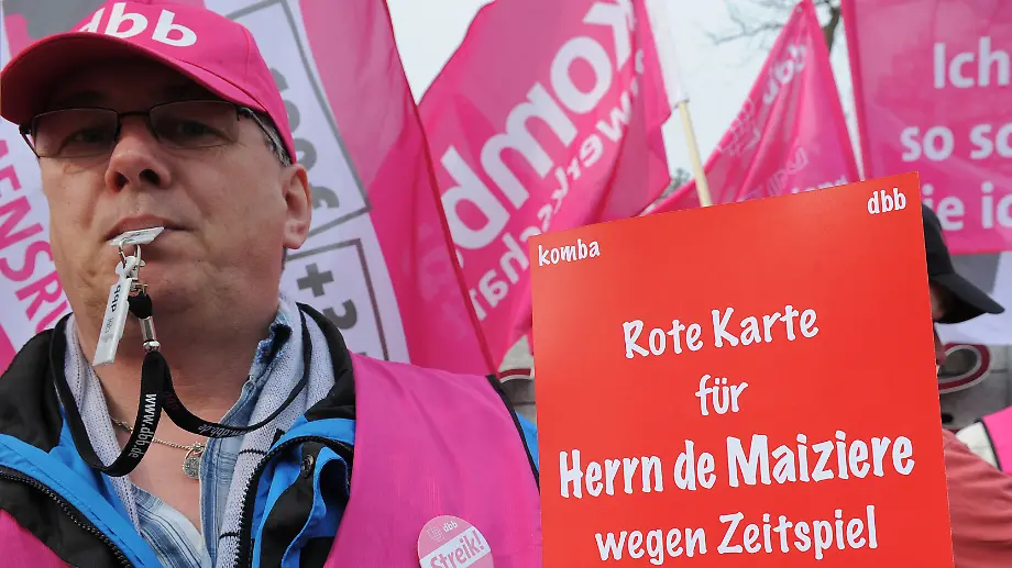 31.03.2014, 16:31 UhrNoch immer steht bei den Tarifverhandlungen für den öffentlichen Dienst eine Einigung aus. In Potsdam werden die Gespräche zwischen Innenminister Thomas de Maizìere und den Arbeitnehmervertretern daher weiter von lautstarkem Protest begleitet.
