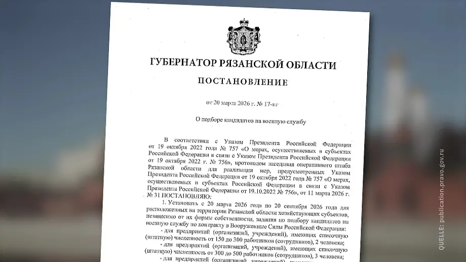 02.04.2026, 20:35 UhrIn der russischen Region Rjasan zwingt ein Dekret Unternehmen zur Auswahl von Mitarbeitern für den verpflichtenden Militärdienst. Kreml-Sprecher Peskow dementiert jede Kenntnis von dem Erlass.
