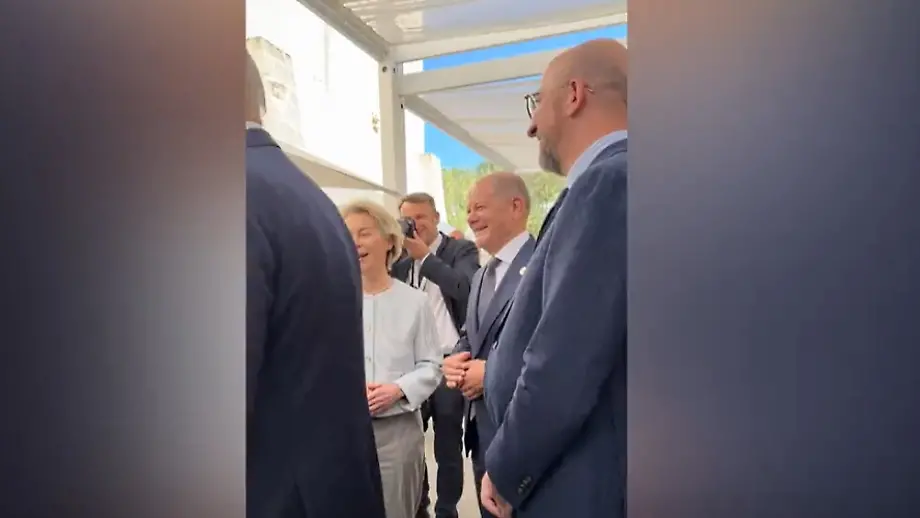 14.06.2024, 15:49 UhrDer zweite Tag des G7-Gipfels in Italien fällt auf den 14. Juni - Olaf Scholz' Geburtstag. US-Präsident Biden motiviert die restlichen G7-Chefs zu einem Geburtstagsständchen und gratuliert dem Bundeskanzler ganz unförmlich: "Happy Birthday, man!"