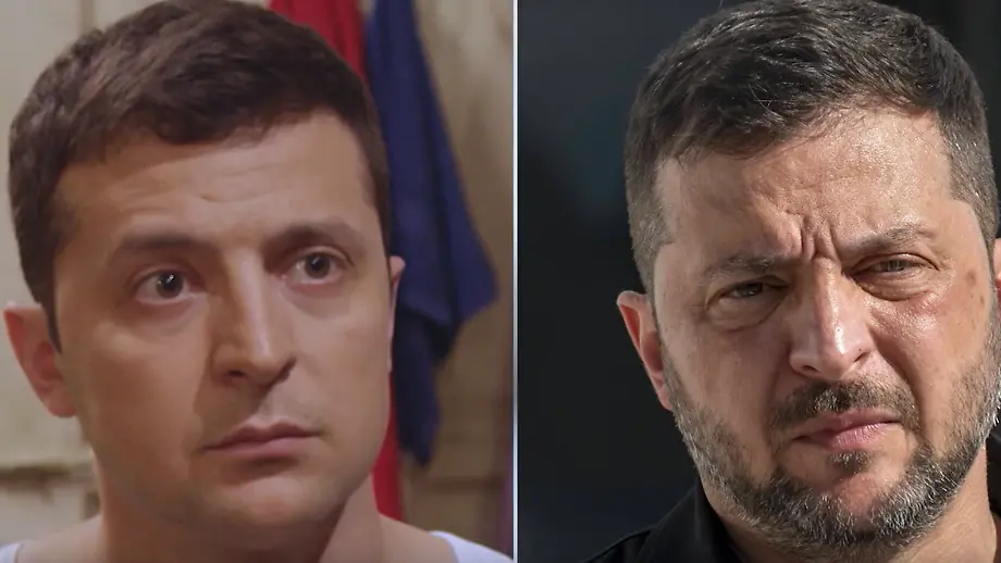 24.02.2026, 18:53 UhrWolodymyr Selenskyj spielt in einer TV-Serie einen Lehrer, der Präsident der Ukraine wird. Dass er sein Land während seiner Amtszeit gegen eine russische Invasion verteidigen muss, dürfte er damals wohl nicht vorausgesehen haben. Die Spuren des jahrelangen Krieges sieht man ihm heute deutlich an.