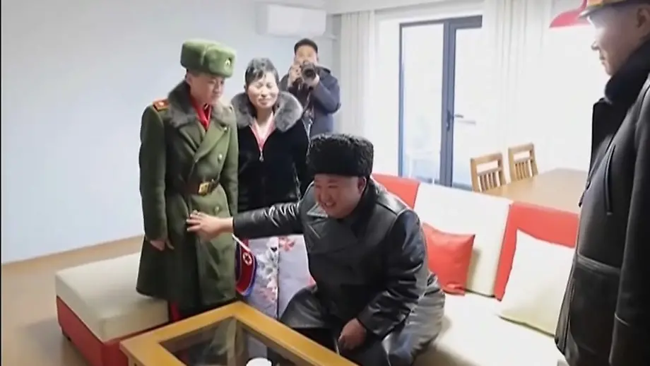Propaganda in neuem WohnviertelKim Jong Un setzt sich bei trauernder Familie aufs Sofa