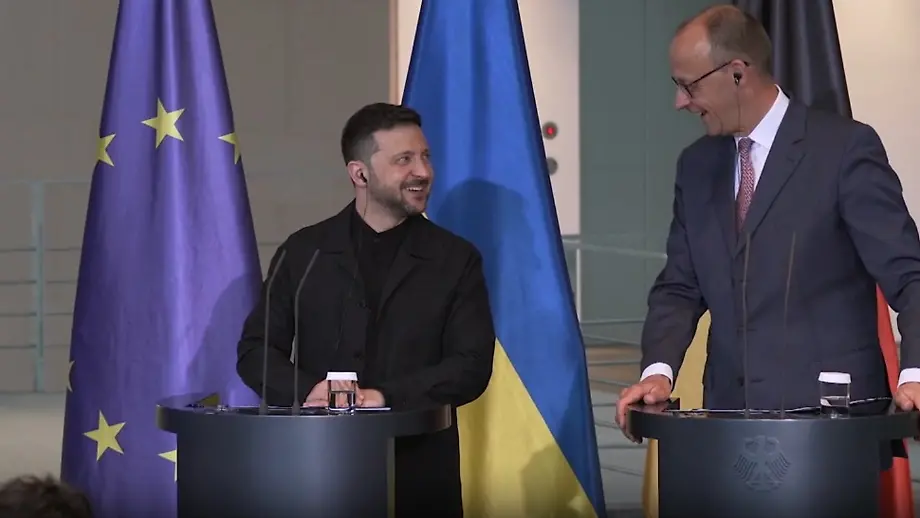 Panne bei PressekonferenzMerz bringt Selenskyj mit "deutscher Technik" zum Lachen