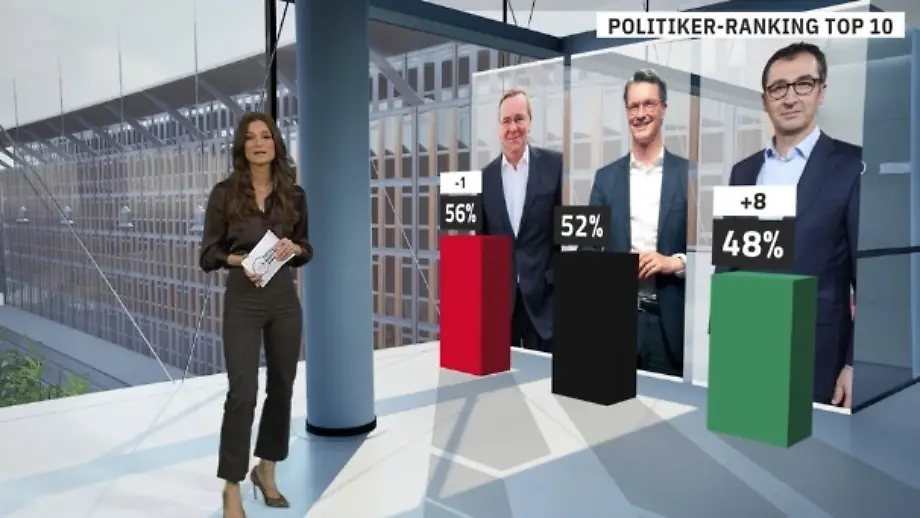 17.03.2026, 16:21 UhrDer sensationelle Aufhol-Erfolg in Baden-Württemberg bringt einen alten Bekannten auch zurück auf die bundespolitische Bildfläche: Cem Özdemir. Der Grüne schnellt im neuen Politiker-Ranking aus der Versenkung auf Platz drei hoch. An den Dauer-Spitzenreiter kommt aber auch er nicht heran.