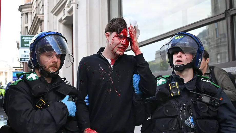 14.09.2025, 13:52 UhrEinem Aufruf des ultrarechten Aktivisten Tommy Robinson sind in London über 100.000 Menschen gefolgt. Beim Versuch eine Gegendemonstration anzugreifen, kommt es zu Auseinandersetzungen mit der Polizei, mehrere Beamte werden verletzt.