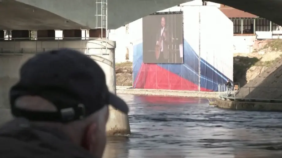 10.05.2023, 14:14 UhrEigentlich hat die Grenzstadt Narva, die zwischen Estland und Russland liegt, Feiern zum "Tag des Sieges" verboten. Russische Veranstalter übertragen dennoch ein Konzert auf Großleinwänden, die vom Grenzfluss aus zu sehen sind. Die Stadt antwortet der Provokation mit einer eigenen Botschaft.