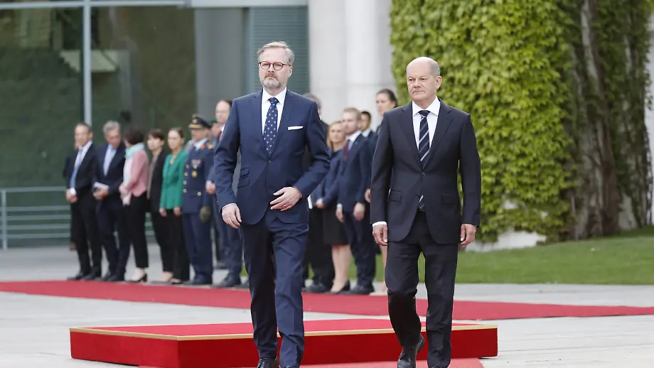 05.05.2022, 21:09 UhrGroßes Thema des Besuchs von Petr Fiala in Berlin ist eigentlich die Energieversorgung, speziell mithilfe von Flüssiggas. Doch zu Beginn der gemeinsamen PK von Olaf Scholz und dem tschechischen Präsidenten spricht der Bundeskanzler zunächst über die NATO und anstehende Waffenlieferungen.