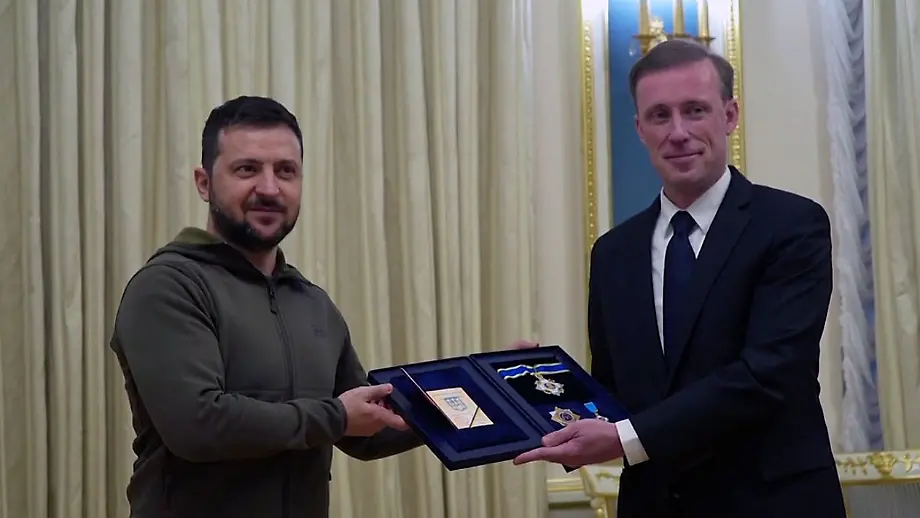 Luftalarm bei Buschmann-BesuchSelenskyj überrascht Biden-Berater mit Medaille