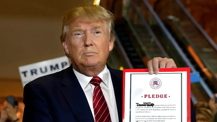 04.09.2015, 08:07 UhrDer US-Milliardär Donald Trump schließt nun doch aus, bei den Präsidentschaftswahlen im Jahr 2016 als unabhängiger Kandidat ins Rennen zu gehen. Trump unterzeichnet eine entsprechende Erklärung. Die Ankündigung ist ein Wechsel in der Strategie Trumps: Bisher hatte er erwogen, als unabhängiger Kandidat anzutreten, sollte er nicht von den Republikanern nominiert werden.