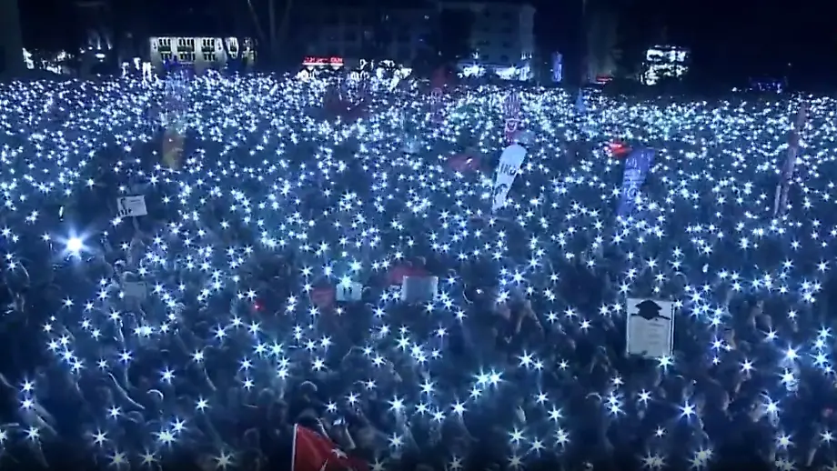 08.05.2025, 17:40 UhrDie Proteste für die Freilassung des inhaftierten Ekrem Imamoğlu in der Türkei reißen nicht ab. In Istanbul halten die Demonstranten unter Anweisung des Oppositionsführers Özel Lichter in die Luft, um ein Zeichen für den Erdoğan-Gegner zu setzen.