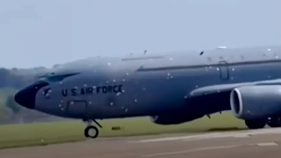 13.04.2026, 13:47 UhrAuf einer Militärbasis in Großbritannien landet ein KC-135-Stratotanker der US-Luftwaffe - übersät mit unzähligen kleineren Schäden. Das Tankflugzeug wurde vermutlich vor Wochen bei einem iranischen Angriff in Saudi-Arabien beschädigt.