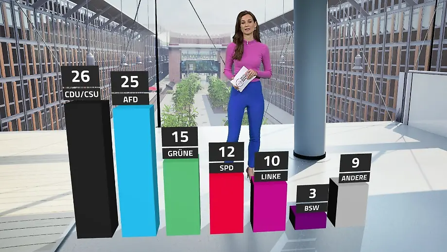 31.03.2026, 14:01 UhrDie politische Lage bleibt festgefahren: Die Union verharrt im aktuellen RTL/ntv-Trendbarometer bei 26 Prozent und liegt nur knapp vor der AfD. Die SPD bleibt im Keller, die Grünen stehen auf Platz drei. Besonders brisant sind die Werte für Friedrich Merz. Der Kanzler rutscht weiter ab - nur noch 23 Prozent bescheinigen ihm gute Arbeit.