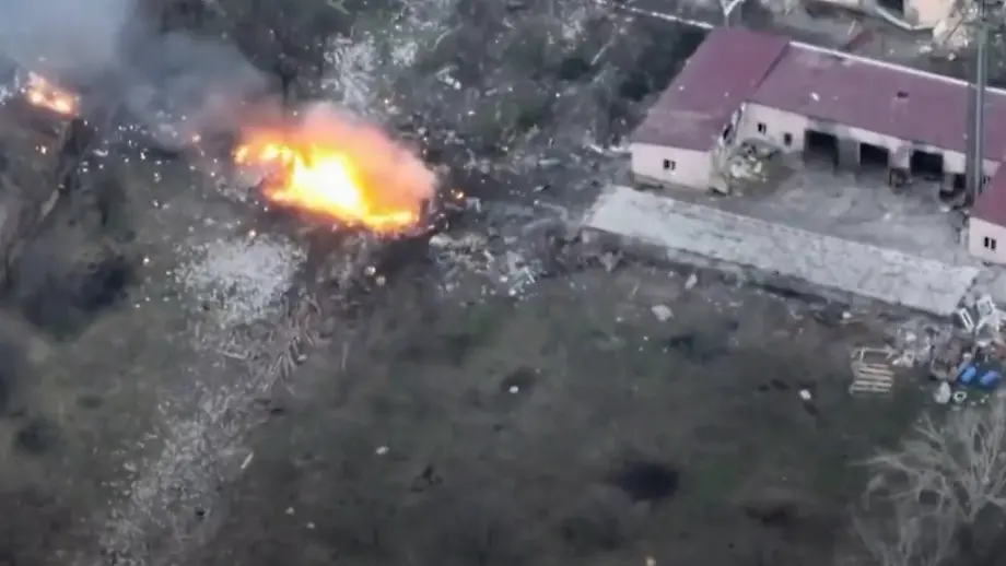 04.04.2023, 09:03 UhrDrohnenaufnahmen des ukrainischen Militärs sollen die Vernichtung von russischer Munition und anderer Ausrüstung zeigen. Die Bilder stammen aus dem Ort Paraskoviivka nahe der Stadt Bachmut. Unklar ist, wann genau das Video aufgezeichnet wurde.