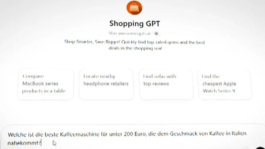 08.05.2025, 11:48 UhrUm die unzähligen Angebote, die es im Internet gibt, zu sortieren, benutzen die allermeisten Menschen Suchmaschinen. Doch seit Neuestem bietet sich auch ChatGPT als Kaufberater an. Was die KI zu bieten hat, testet ntv am Beispiel einer Kaffeemaschine.