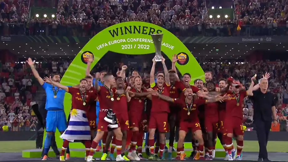 25.05.2022, 23:43 UhrJosé Mourinho gewinnt mit der AS Rom die Conference League im ersten Jahr des neuen Wettbewerbs - und damit seine dritte unterschiedliche Europacup-Trophäe. Nach dem 1:0 (1:0)-Triumph im Premierenfinale in Tirana gegen Feyenoord Rotterdam brechen alle Dämme.