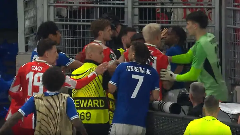17.04.2026, 06:41 UhrNach dem Mainzer Aus in der Conference League fliegen die Fetzen: Das Spiel ist längst abgepfiffen, da kommt es vor dem Gästeblock zu einer Auseinandersetzung zwischen Nadiem Amiri und einem Straßburger Spieler. Als die Lage eskaliert, müssen Ordner einschreiten, um das Massengerangel aufzulösen.
