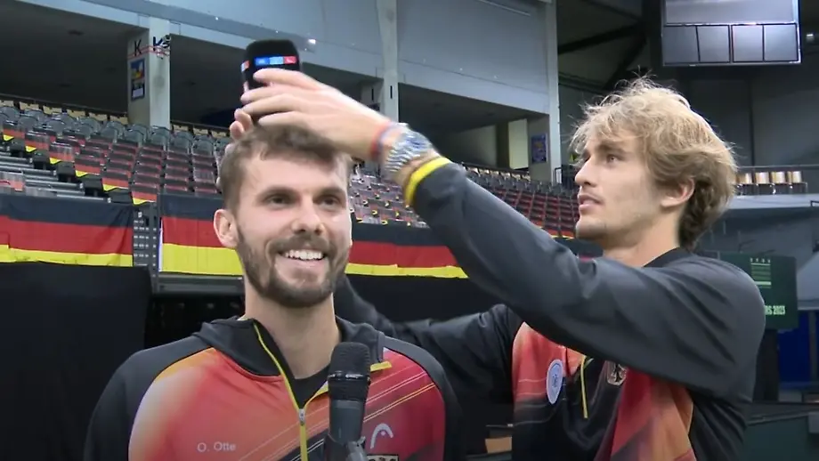 02.02.2023, 17:58 UhrDa war wohl jemand in Spaßvogel-Laune: Als sein Davis-Cup-Mitspieler Oscar Otte ein Interview geben will, drängt sich Alexander Zverev mehrmals vor die Kamera, schmeißt Schuhe, verpasst ihm sogar eine ntv-Krone. Otte erträgt das Ganze und lobt seinen Kollegen am Ende sogar.
